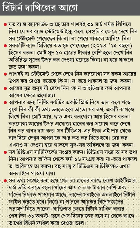 মেয়াদি আমানতে সুদের হার বছরে ১০ হাজার টাকার বেশি হলে ব্যাঙ্ক উৎসে ১০ শতাংশ কর কেটে নেয় (টিডিএস)। আপনি যদি ২০% অথবা ৩০% করের আওতায় পড়ে থাকেন, তবে আপনাকে রিটার্ন ফাইল করার আগে বাকি কর জমা করতেই হবে। এ ছাড়া, অবশ্যই মনে রাখবেন আপনাকে কিন্তু শিক্ষা সেস বাবদও ৩% অর্থ দিতে হবে।