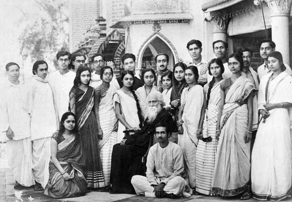 নৃত্যনাট্য চিত্রাঙ্গদা-র শিল্পীদের নিয়ে দিল্লিতে রবীন্দ্রনাথ। মাটিতে বসে নন্দিতা কৃপালনি ও শান্তিদেব ঘোষ।