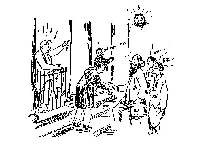 রবি-স্যর: বিশ্ববিদ্যালয়ে পড়াতে ঢুকছেন রবীন্দ্রনাথ। ‘শনিবারের চিঠি’-তে প্রকাশিত কার্টুন।