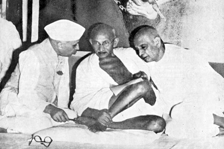 ১৯৪৬-এর জুলাই মাসে বোম্বাইয়ে অল ইন্ডিয়া কংগ্রেস কমিটির সভায় নেহরু ও পটেলের সঙ্গে গাঁধী।