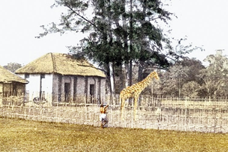 ব্যারাকপুর চিড়িয়াখানায় জিরাফ। ১৮৫১ সালে ফ্রেডরিক ফিবিগ-এর তোলা ফোটোগ্রাফ, হাতে রং করা। ছবি সৌজন্য: ব্রিটিশ লাইব্রেরি