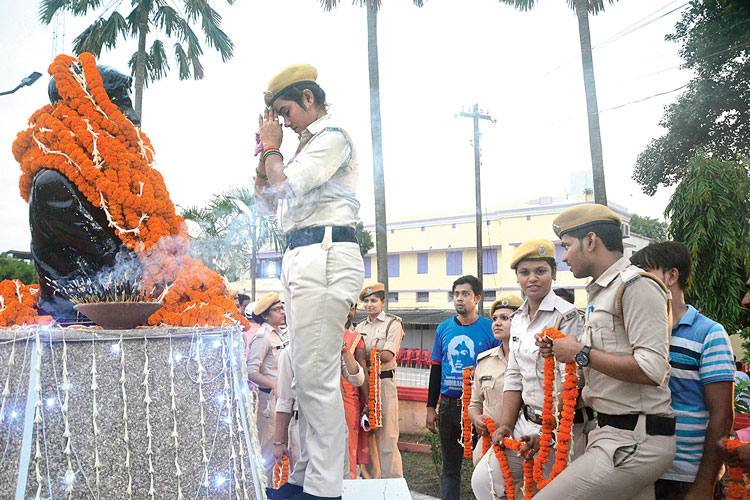 মুজফ্ফরপুর জেল চত্বরের পার্কে তাঁর আবক্ষ মূর্তিতে শ্রদ্ধা জানাচ্ছেন পুলিশকর্মীরা