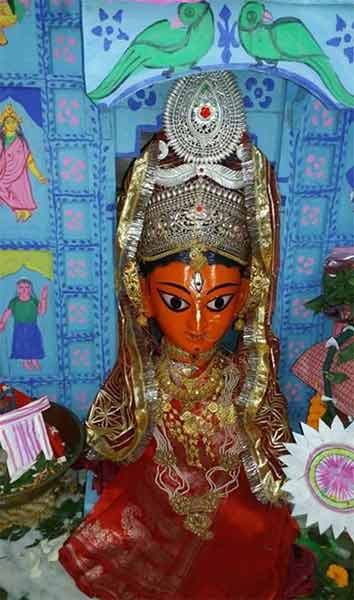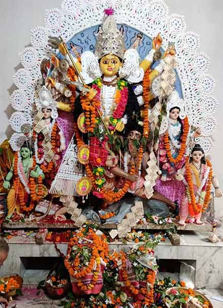 দেড় শতক ধরে এই পুজোর সাক্ষী অঞ্চলবাসী। বংশের এক পূর্বপুরুষ স্বপ্নে মায়ের পুজোর আদেশ পান। অত্যন্ত দরিদ্র ছিলেন তাঁরা। দেবী বলেন মাটির দেওয়ালে মূর্তি এঁকে পুজো করতে। স্বপ্নাদিষ্ট সেই মূর্তিতে দেবী দুর্গার দু’পাশে লক্ষ্মী, সরস্বতী, কার্তিক গণেশের বদলে ছিলেন জয়া-বিজয়া, রাম ও লক্ষ্মণ।