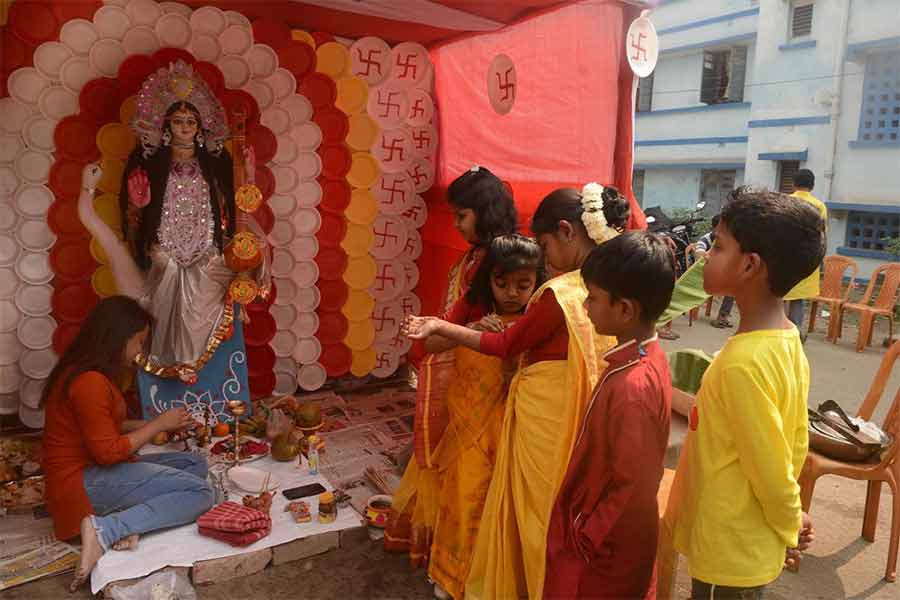 সাড়ে ন’টা নাগাদ পুরোহিতমশাই চলে এলেন। পুজো শুরু হল নিরুপদ্রবে। শেষ মুহূর্তে সুরমা ঘাবড়ে গিয়ে হয় সলতে, নয় ভুজ্যিপাত্র, কিছু না কিছু আনতে ভুলে যান, তা এ বারও হল যদিও। ঝামেলা হল অঞ্জলি দিতে বসে। কোনও এক অজ্ঞাত কারণে অঞ্জলি দিতে বসলেই শমীক হাসতে শুরু করে। এ বারও তা-ই হল। একটা বাচ্চা হাসলে সেটা সমস্যা নয়, কিন্তু শমীকের হাসি এতই ছোঁয়াচে, কোচিং-এর ছেলে, মেয়ে থেকে সুরমা এবং সবাইকে ধমক দিতে গিয়ে শেষে নিজেও হেসে ফেললেন নিত্যবাবু। পুরোহিতমশাই এক জন শিক্ষকের অবিমৃশ্যকারিতা দেখে কটমট করে তাকিয়ে থাকলেন শুধু।