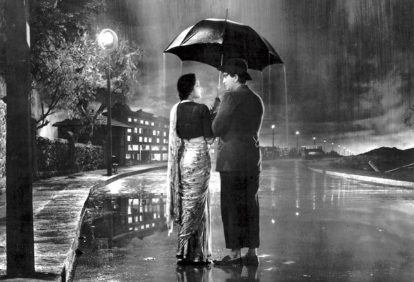‘শ্রী ৪২০’ ছবির আইকনিক দৃশ্য। নার্গিস-রাজ কপূর, বৃষ্টি, আর ছাতা। এ ছবিটা যদিও ১৯৫৫-র,