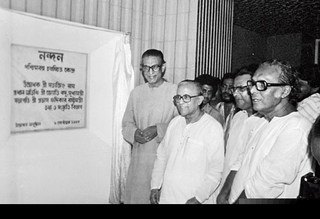 ‘নন্দন’-এর উদ্বোধনে তৎকালীন মুখ্যমন্ত্রী জ্যোতি বসুর সঙ্গে সত্যজিৎ রায় ও মৃণাল সেন। ২ সেপ্টেম্বর ১৯৮৫।