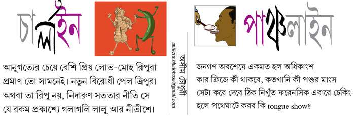 পরে এক দিন। টোকেন নিয়ে বসে আছি, টাকা তুলব। লোকটা বলল, টিভিতে দেখেছেন তো— এমএলএ-এমপি’দের সামনে টাকার বান্ডিল? খুব সুন্দর, না? আমার নীরবতার মধ্যেই লোকটা বলল, খুব তৃপ্তি পেয়েছি দেখে। ওদের সুখেই আমার সুখ। আমি তখন শতমুখে খাই। বুঝলেন, শ্রীরামকৃষ্ণের তখন গলায় অসুখ, শিষ্যরা সন্দেশ এনেছে, উনি খেতে পারবেন না। বললেন, তোমরা খেলেই আমার সুখ, তখন আমি শতমুখে খাই। আমারও সে’রম। ওই পোজটা আমার বেশ লেগেছে, নেতা দাদা লুঙ্গিতে, বিছানায় আধশোয়া, সামনে নোটের বান্ডিল রেখে গেল, উনি আড়চোখে চাইলেন শুধু, যেন ও কিছু না, মুখে কী শান্তি!