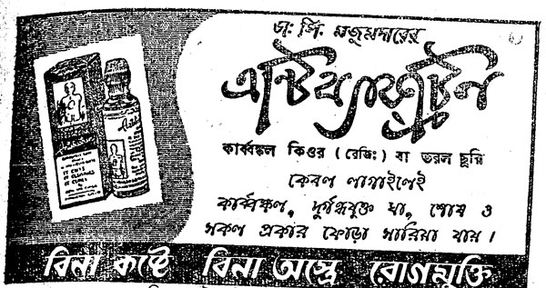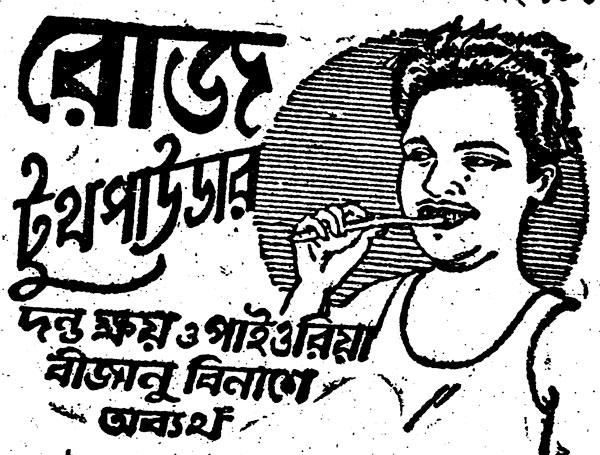 পঞ্চাশ থেকে ষাটের বিজ্ঞাপনে অসুখ হইতে সুখে লইয়া যাইবার এমন অজস্র হাতছানি। কারণটা বোধহয় লাগাতার রোগবিমারি, বাঙালির স্বল্প আয় ও অল্প আয়ু, অ্যালোপাথি-র চিরকালীন কড়া দাম। তাই, রাশি রাশি ক্ষতান্তক ঘৃত, শক্তিবিলাস বটী, সারস্বতারিষ্ট, চন্দ্রপ্রভা (ত্বকের ছোপবিনাশক), শিরঃশূলান্তক তৈল, পূযশান্তি (কানের পুঁজের জন্য), কৃমীঘাতিনী, যকৃৎকল্যাণ, চক্ষুরক্ষক পদ্মমধু, প্রমায়ুকল্যাণ বটী, রক্তগজন্তানাশক। আদ্ধেকের গুণপনা নামেই মালুম, অন্যগুলি উচ্চারণমাত্র রোগবাছাধন পাড়াছাড়া! হ্যাঁ, সে চেষ্টায় দাঁত কিঞ্চিৎ নড়ে যেতে পারে। তখন ‘রোজ টুথপাউডার’-এ মঞ্জন করলেই দন্তক্ষয় রোধ হবে। ‘সডাকে ৬টী লইলে টুথব্রাস ফ্রি’।