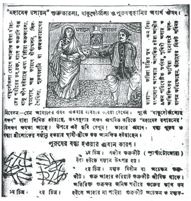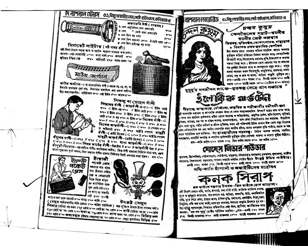 আর এক রকম সুখের তো এক্কেরে হাট বসেছে হাতে পাঁজি মঙ্গলবারে। সে সব অবশ্য বেশ পুরুষতান্ত্রিক। মিছেই আজকালকার খুল্লমখুল্লা বিজ্ঞাপনের নিন্দামন্দ। পাতায় পাতায় কুহকিনী, হুরপরিদের সন্ধান। বিশেষাঙ্গ পুষ্টিবর্ধক তৈল। শয়নশাস্ত্র (‘বিজ্ঞাপনে পুস্তকের মূল রহস্যের পরিচয় দেওয়া অসম্ভব। মধুর দৃশ্য দেখিতে চাহিলে এক সেট ফোটোকার্ডের জন্য লিখুন’)। বটতলার বই, অ্যাডাল্ট উপন্যাস। ‘অভিশপ্তা ঊর্বশী’। ‘হাসিরাশি দেবীর লেখা নিষ্প্রদীপা। বলিষ্ঠ প্রেমমধুর উপন্যাস আগে কখনও পড়েননি।’