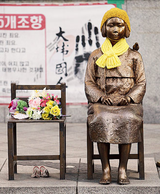 কী মূর্তি? ২০১১ সালে, এক নাগরিক সংগঠনের উদ্যোগে, দক্ষিণ কোরিয়ার রাজধানী সোল শহরে জাপানি দূতাবাসের সামনে একটি কোরিয়ান বালিকার মূর্তি বসানো হয়। কোলের ওপর হাত দুটো রাখা, আর বিষণ্ণ মুখ। জাপানি দূতাবাস থেকে বেরনোর সময় প্রত্যেকে যেন ওই মূর্তিটি দেখে মনে রাখে, কোরিয়ান মেয়েদের প্রতি কী সাংঘাতিক অন্যায় হয়েছে, এবং তার কোনও রকম প্রতিকার হয়নি। জাপানের দাবি, ওই স্ট্যাচুটা সরাতে হবে। আসলে বক্তব্য হল, অপরাধের চিহ্ন মুছে দাও। কিছু টাকা তো দিচ্ছি। আর কেন বাপু? কিন্তু কমফর্ট উইমেনরা অনেকেই এই ক্ষমায় রাজি নন।