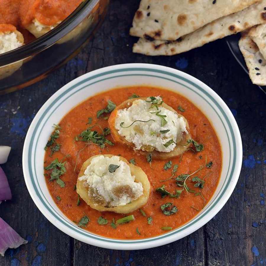 নাম গালভরা। তবে বিষয়টি খুব কঠিন নয়। চেনা পুর ভরা আলুরদমই। তবে একটু অন্য পদ্ধতিতে। অন্য স্বাদে। এখানে ভাজা আলুর খোলে ভরা থাকবে হালকা মশলায় মাখানো সুস্বাদু পনিরের পুর। তার পরে তাকে ফেলা হবে মশলাদার গ্রেভি বা কারির ভিতরে।