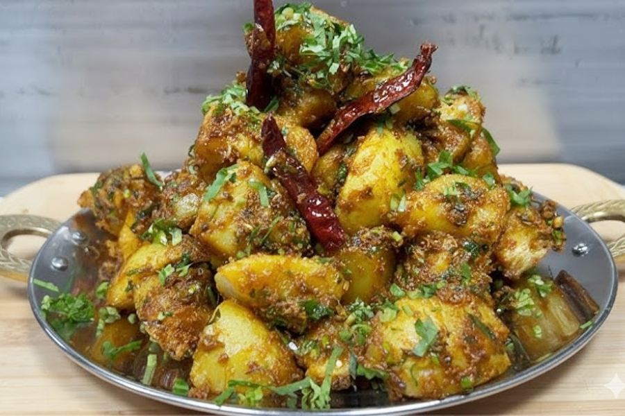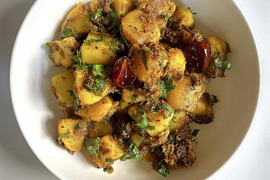 তেল ছেড়ে এলে ওর মধ্যে দিয়ে দিন সেদ্ধ করা আলু। ভাল ভাবে মশলার সঙ্গে আলু মাখিয়ে নিন। ভাজা ভাজা হয়ে এলে উপরে অল্প ধনেপাতাকুচি এবং লেবুর রস ছড়িয়ে নামিয়ে নিন।