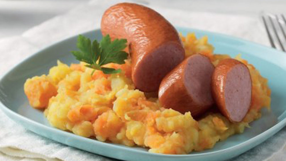 এ বার একটি বড় ডেকচিতে অল্প নুন ও জল দিয়ে তার মধ্যে টুকরো করা আলু, গাজর ও পেঁয়াজ দিয়ে চাপা দিয়ে রাখুন। অল্প জল দিয়ে কম আঁচে চাপা দিয়ে রাখলে সেদ্ধ হতে বেশি সময় লাগবে না। এ ছাড়া আলু, গাজর পেঁয়াজ থেকেও জল বেরবে। সেদ্ধ হয়ে গেলে ম্যাশার দিয়ে সব সব্জি একসঙ্গে মিশিয়ে নিতে হবে। মাঝে মাঝে মাখন আর ঘন দুধ যোগ করে ভাল করে মিশিয়ে নিন। মেশানো পর এর মধ্যে নুন, কাঁচালঙ্কা, গোলমরিচ গুঁড়ো ও চিনি দিয়ে আরও এক বার ভাল করে মেখে নিতে হবে। এ বার এর মধ্যে পার্সলে কুচি ও বাকি মাখন মিশিয়ে নিন। সার্ভিং বোলে ভাল করে সাজিয়ে কোরানো চিজ ও চিকেন সসেজ বা ভাজা অমলেটের টুকরো সাজিয়ে পরিবেশন করুন। এটা একটা কমপ্লিট ডিশ। ইচ্ছে হলে রুটি বা পাউরুটি দিয়ে খেতে পারেন।