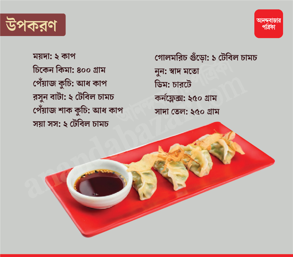 ময়দায় সামান্য নুন মিশিয়ে মণ্ড বানিয়ে নিন। ময়দা মাখা যেন খুব বেশি শক্ত না হয়ে যায় সেই দিকে খেয়াল রাখুন। এরপর মাকা ময়দার গায়ে সামান্য সাদা তেল মাখিয়ে ১৫-২০ মিনিট মসলিন কাপড়ে ঠেকে রেখে দিন। এর পর একটি পাত্রে চিকেন কিমা নিয়ে একে একে পেঁয়াজ কুচি, রসুন বাটা, পেঁয়াজ শাক কুচি, সয়া সস, গোল মরিচ গুঁড়ো, নুন মিশিয়ে হালকা তেলে সতে করে নিন। এ বার ময়দার মণ্ড থেকে ছোট ছোট লেচি করে নিয়ে লুচির আকারে পাতলা করে বেলে নিন। এ বার তাতে চিকেনের পুর দিয়ে পুলি পিঠের আকারে গড়ে নিন। আপনি চাইলে ইচ্ছে মতো অন্য আকারও দিতে পারেন। এই ভাবেই একে একে বাকি মোমোগুলিও গড়ে রাখুন। কর্নফ্লেক্সগুলি মিক্সারে ঘুরিয়ে গুঁড়ো করে রাখুন।
