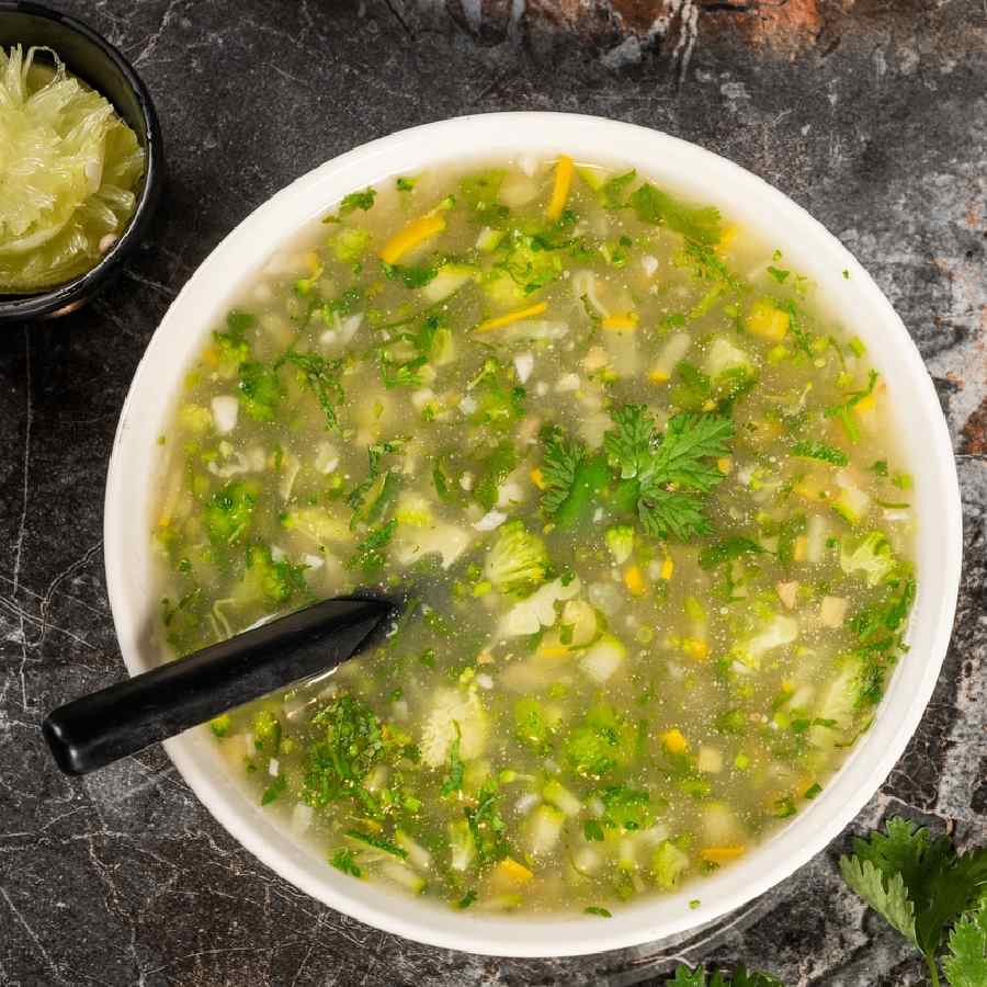 লেবুও স্বাদ ফেরাতে দারুণ কার্যকর! এই সময়ে গরমাগরম লেমন করিয়্যান্ডার স্যুপ বানিয়ে খেলেও বেশ আরাম পাবেন। একটি প্রেশার কুকারে সামান্য মাখন নিয়ে তাতে এক চামচ আদা, রসুনবাটা দিয়ে নাড়াচাড়া করুন। তার পর একে একে গাজর, ক্যাপসিকাম, পেঁয়াজ, বাঁধাকপি দিয়ে মিশিয়ে নিন। পরিমাণ মতো জল দিয়ে একটি সিটি দিয়ে নিন। ঢাকনা খুলে একটি লেবুর রস, গোলমরিচের গুঁড়ো আর কর্নফ্লাওয়ারের মিশ্রণ আর ধনেপাতা দিয়ে ভাল করে মিশিয়ে নিন। ঘন হয়ে এলে গরম গরম স্বাদ নিন এই স্যুপের।
