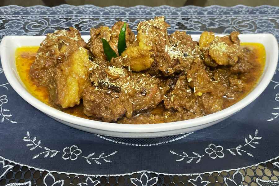 পুজোয় অন্তত একটা দিন কষা মাংস আর পোলাও খেতে চাওয়া বাঙালিকে পাঁঠার মাংস না খাইয়ে ছাড়বেন না নয়না। তবে তিনি বললেন, ‘‘চেনা রান্না নয়, এ বার পুজোয় একটু অন্যরকম পাঁঠার মাংস খাওয়াবো। এমন মাংস যাতে চেনা মালাইকারির স্বাদও পাওয়া যাবে।’’ যেমন কথা তেমন কাজ। নয়না পাঁঠার মাংস কষালেন বটে, তবে কষানোটা হল নারকেল দুধ দিয়ে। স্বাদ কেমন হল? তা জানতে বরং সপ্তমীর দুপুরে নিজেই বানিয়ে দেখে নিন।