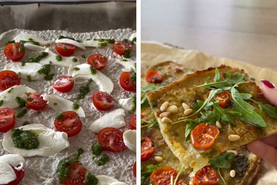এ বার মিশ্রণটি একটি বেকিংয়ের কাগজে গোল বা চৌকো আকারে ছড়িয়ে তার উপর পছন্দের ‘টপিং’ ছড়িয়ে দিন। চেরি টম্যাটো, মোজ়ারেলা পেস্তো সস দিয়ে প্রি হিটেড অভেনে (১৭৫ ডিগ্রি সেলসিয়াস) বেক করুন ২০-২৫ মিনিট।