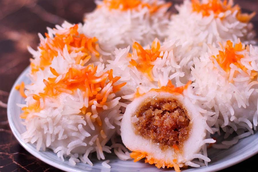 প্রথমে বাসমতী চাল ভল করে ধুয়ে ভিজিয়ে রাখুন আধ ঘণ্টা। তার পর জল ঝরিয়ে নিন। ননস্টিক পাত্র গরম করে গুড় আর নারকেল দিয়ে ভাল করে মিশিয়ে নিন। মিশ্রণে পাক ধরে এলে তাতে এলাচগুঁড়ো মিশিয়ে নিন। গ্যাস বন্ধ করে পুর ঠান্ডা হতে দিন। আর একটি পাত্রে ১ কাপ জল গরম করে তাতে চালের গুঁড়ো মিশিয়ে একটি মণ্ড বানিয়ে নিন। মণ্ডটি হালকা গরম থাকতে থাকতেই ভাল করে মেখে নিন। এ বার মণ্ড থেকে ছোট ছোট লেচি কেটে নিন, এ বার একটি লেচি থেকে বাটি বানিয়ে নিন। বাটির ভিতরে ভরে দিন নারকেলের পুর। এ বার ছোট ছোট বল বানিয়ে নিন। বলগুলির গায়ে চালের প্রলেপ মাখিয়ে নিন ভাল করে। এ বার উপরে এক ফোঁটা ফুড কালার দিয়ে দিন। স্টিমার গরম করে বানিয়ে রাখা পিঠেগুলি ভাপিয়ে নিন। তা হলেই তৈরি হয়ে যাবে কদম পিঠে।