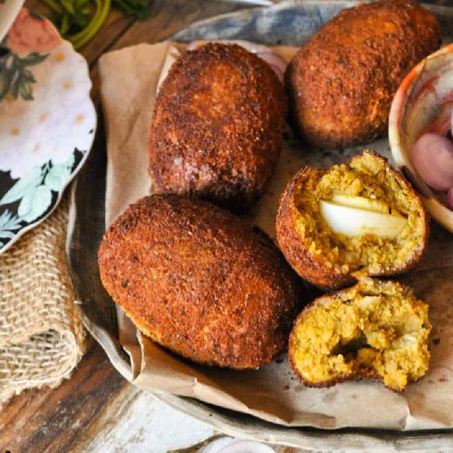 এ বার প্রতিটি সেদ্ধ ডিমের অর্ধেক টুকরো নিয়ে সেটি ওই আলুর মশলায় মুড়ে ডিম্বাকারে গড়ে নিন।