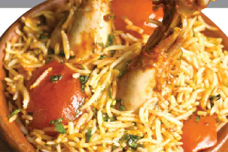 প্রণালী: চাল ভাল করে ধুয়ে নিয়ে ৪৫ মিনিট ভিজিয়ে রাখুন। প্যানে ঘি গরম করে গোটা গরম মশলাগুলো (তেজপাতা, এলাচ, দারুচিনি, লবঙ্গ, জয়িত্রী) দিন। ঝিরিঝিরি করে কাটা পেঁয়াজ ও নুন দিয়ে সোনালি রং আসা অবধি ভাজুন। এ বার আদা-রসুন বাটা দিয়ে নাড়াচাড়া করতে হবে। এর মধ্যে মাংস, টক দই, এলাচ গুঁড়ো, নুন, কাঁচা লঙ্কা, গরম মশলা দিয়ে কষতে থাকুন। অন্য একটি পাত্রে জল ফুটিয়ে তার মধ্যে ঘি ও নুন দিয়ে চাল ফোটান। চাল ৮০ শতাংশ সিদ্ধ হয়ে গেলে ফ্যান ঝেড়ে নিন। একটি তামার সার্ভিং বোলে একদম নীচে চিকেনের লেয়ার তৈরি করুন। তার উপরে ভাতের স্তর সাজান। উপরে আবার মাংস দিয়ে ঢেকে দিন। এ বার একটি পাত্রে ঘি নিয়ে দু’-তিন মিনিট গরম করে বিরিয়ানির উপরে ছড়িয়ে দিন। গোলাপজল, কেওড়া জল ও খুস রুট পাউডার উপর থেকে ছড়িয়ে দিন। পাত্রটির মুখে ঢাকনা চাপা দিয়ে আটার মণ্ড দিয়ে মুখটা সিল করে দিন। এ ভাবেই ২৫ মিনিট কম আঁচে দম দিন। নামিয়ে গরম গরম পরিবেশন করুন।