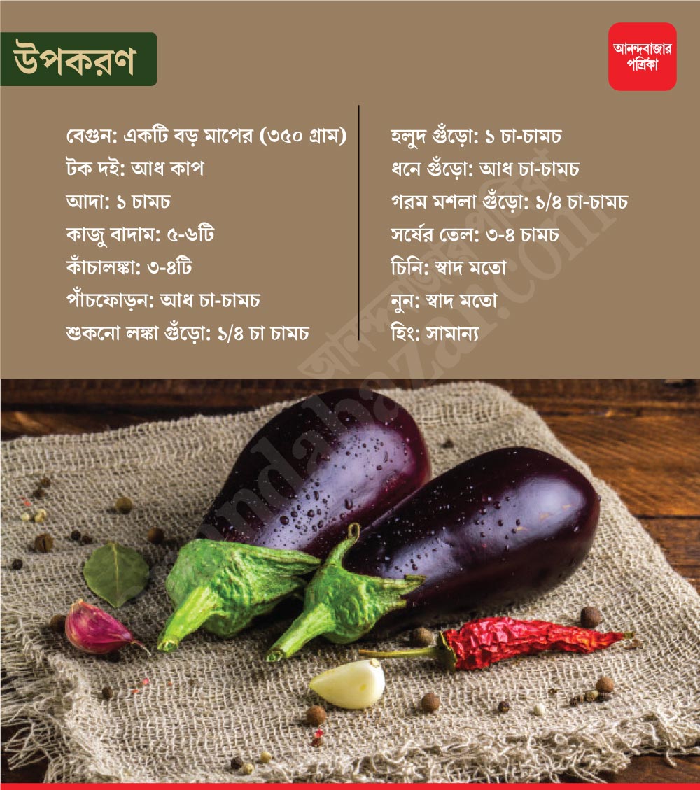প্রথমে গোটা বেগুনটিকে গোল গোল করে কেটে নিয়ে তাতে সামান্য নুন, হলুদ, লঙ্কা এবং চিনি মাখিয়ে পাঁচ থেকে দশ মিনিটের জন্য ঢেকে রাখুন। এ বার একটি পাত্রে টক দই ঢেলে তাতে হলুদ, ধনে গুঁড়ো এবং স্বাদ মতো নুন ও চিনি দিয়ে ভাল করে ফেটিয়ে নিন। এর পর একটি কড়াইয়ে দু’চামচ তেল দিয়ে নিন। তেল গরম হয়ে গেলে নুন-হলুদ মাখানো বেগুনগুলি কড়াইতে ছেড়ে দিন। অল্প ভাজা ভাজা হয়ে এলে একটি পাত্রে তুলে রাখুন এবং ওই একই কড়াইয়ে আরও এক চামচ তেল দিয়ে পাঁচফোড়ন, অল্প হিং, একটি গোটা শুকনো লঙ্কা ফোড়ন দিন। তারপর একে একে আদা বাটা, লঙ্কার গুঁড়ো, কাজু বাদাম বাটা দিয়ে হালকা নেড়েচেড়ে নিন। সব শেষে ফেটিয়ে রাখা টক দই দিয়ে অল্প কষিয়ে বেগুনগুলো ছেড়ে দিন এবং ঢেকে সেদ্ধ হতে দিন। উপর চেরা কাঁচালঙ্কা দিয়ে পরিবেশন করুন।