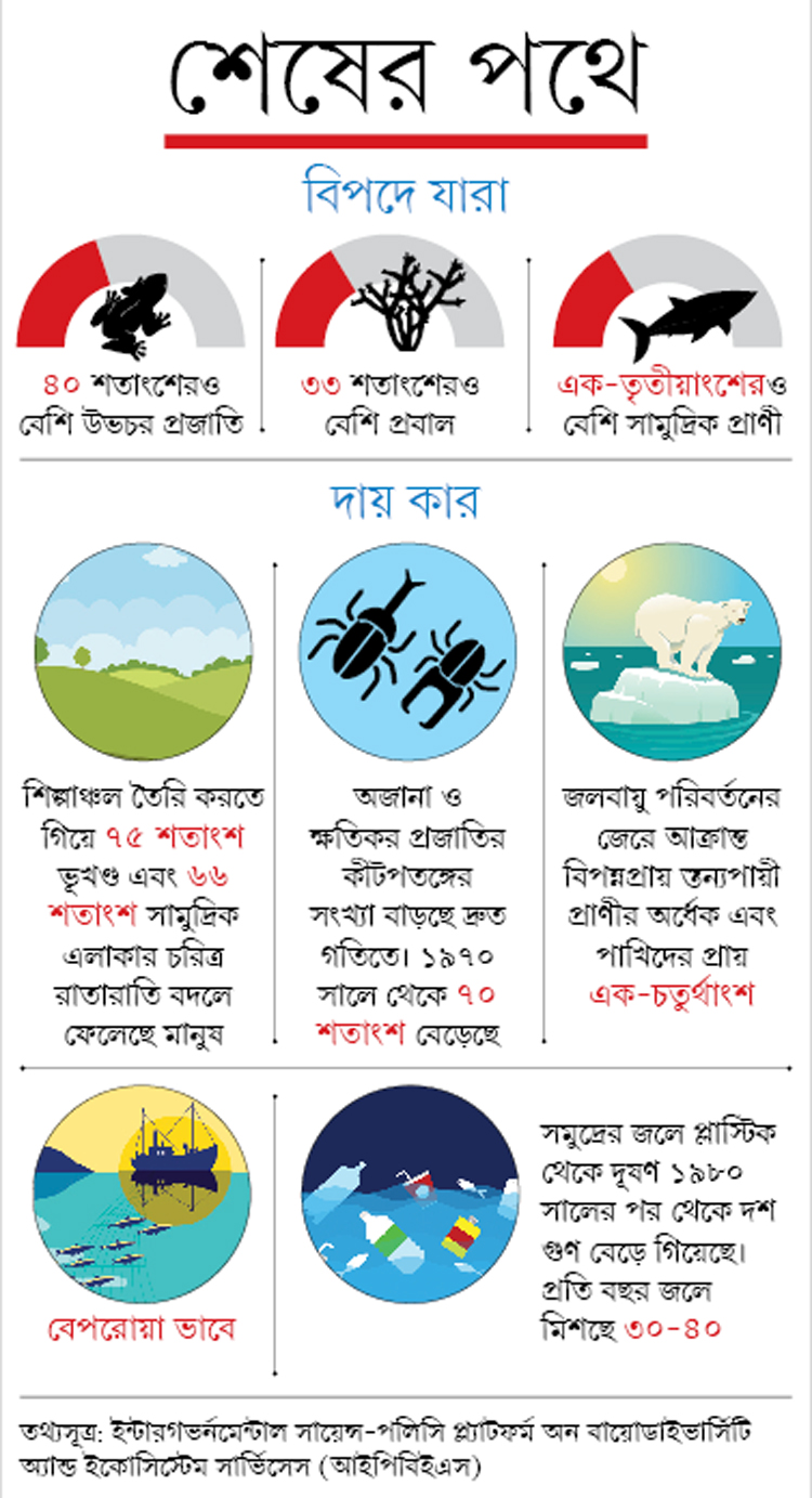 রিপোর্টটি প্রকাশ করেছে রাষ্ট্রপুঞ্জের ‘ইন্টারগভর্নমেন্টাল সায়েন্স-পলিসি প্ল্যাটফর্ম অন বায়োডাইভার্সিটি অ্যান্ড ইকোসিস্টেম সার্ভিসেস’ (আইপিবিইএস)। ৫০টি দেশের ১৪৫ জন বিশেষজ্ঞকে নিয়ে তৈরি কমিটি এই রিপোর্ট তৈরি করেছে, যেখানে দাবি করা হয়েছে— জনসংখ্যা বৃদ্ধি এবং বেপরোয়া ভাবে প্রাকৃতিক সম্পদ ধ্বংসের ফলে বিপন্ন ওই সব প্রজাতি। আগের তুলনায় দশ থেকে একশো গুণ দ্রুত গতিতে নিশ্চিহ্ন হচ্ছে এরা। মূল কারণগুলি হল— বাসস্থান কমছে, অপব্যবহার হচ্ছে প্রাকৃতিক সম্পদের, সেই সঙ্গে জলবায়ু পরিবর্তন এবং দূষণ। আর এই সব কিছুর পিছনে মানুষ। বিপদে ৪০ শতাংশেরও বেশি উভচর, ৩৩ শতাংশেরও বেশি প্রবাল প্রাচীর। নিশ্চিহ্ন হতে বসেছে সামুদ্রিক স্তন্যপায়ী প্রাণীদের এক-তৃতীয়াংশেরও বেশি। আইপিবিইএস-এর অন্যতম বিশেষজ্ঞ রবার্ট ওয়াটসন বলেন, ‘‘বাস্তুতন্ত্রের ভারসাম্য নষ্ট হয়ে যাচ্ছে দ্রুত গতিতে। আমরা বাস্তুতন্ত্রের উপরে নির্ভরশীল। ফলে ভুগতে হবে আমাদেরও।’’