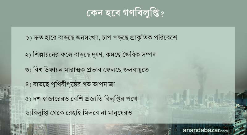 জীবাশ্ম বিশ্লেষণ করেই বিবর্তনের গতিপ্রকৃতি বোঝা যায়। তাতেই বিজ্ঞানীরা দেখেছেন, যা ভাবা হয়েছিল তার চেয়ে অনেক বেশি মাত্রায় এই বিনাশ ঘনিয়ে আসবে পৃথিবীর বুকে। কারণ, দ্রুত হারে কমে আসছে জৈব সম্পদ। মাত্রা ছাড়াচ্ছে দূষণ। সেই সঙ্গে পৃথিবীর বায়ুমণ্ডলে বাড়ছে কার্বন ডাই-অক্সাইড, নাইট্রাস অক্সাইড, মিথেন, ক্লোরোফ্লুরোকার্বনের মতো গ্রিন হাউস গ্যাস। তার ফলে পাল্লা দিয়ে বাড়ছে উষ্ণায়ন।