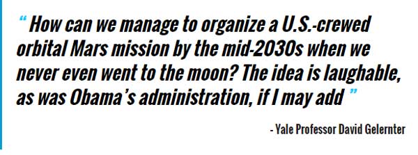 গত ২৪ জানুয়ারি নতুন মার্কিন প্রেসিডেন্টের বিজ্ঞান উপদেষ্টাকে সাংবাদিকরা প্রশ্ন করেছিলেন, ‘‘তিরিশের দশকের মধ্যেই কি আমরা (আমেরিকা) মঙ্গল গ্রহে পাঠাতে পারব মহাকাশচারীদের?’’ ওই প্রশ্নে বিন্দুমাত্র কালক্ষেপ না করেই মার্কিন প্রেসিডেন্টের বিজ্ঞান উপদেষ্টা অধ্যাপক গেলার্নটার ঝটিতি জবাব দেন, ‘‘আমরা এখনও পর্যন্ত চাঁদেই যেতে পারলাম না! তা হলে আর কী ভাবেই-বা তিরিশের দশকের মাঝামাঝি মানুষ পাঠাতে পারব মঙ্গলে? খুবই হাস্যকর ভাবনা! আমার বলা উচিত কি না জানি না, এ সব ওবামা প্রশাসনের ভাবনা ছিল। খুব হাস্যকর! খুব হাস্যকর!’’