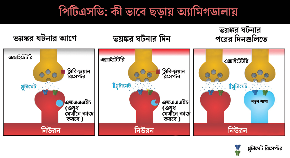 সেই অ্যামিগডালা, যা আমাদের মস্তিষ্কে ভয়, রাগ, সুখ, দুঃখ, ভালবাসা, সব রকমের অনুভূতির আঁতুড় ঘর। আমাদের যাবতীয় অনুভূতির সেই আঁতুড় ঘরের অতি-সক্রিয়তাই (হাইপার-অ্যাক্টিভিটি) পিটিএসডি রোগীদের মানসিক ভাবে প্রতিবন্ধী করে দেয় অনতিদূর ভবিষ্যতে।