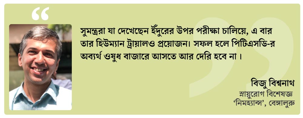 বিজু-সহ অন্য বিশিষ্ট স্নায়ুরোগ বিশেষজ্ঞরা বলছেন, ‘‘যে দু’-একটি ওষুধ বাজারে রয়েছে, সেগুলি ‘এটা কাজে না লাগলে ওটা’ এই নীতিতে চলে। ওষুধগুলির বেশির ভাগই কিছুটা কার্যকরী হয় রোগের প্রাথমিক পর্যায়ে। যে সময়ে রোগটাই অনেক ডাক্তারের চোখে ধরা পড়ে না। পরিবারও বুঝতে পারে না বলে রোগীকে ডাক্তারের কাছে নিয়ে যায় না। তবে সুমন্ত্ররা যা দেখেছেন ইঁদুরের উপর পরীক্ষা চালিয়ে, এ বার তার হিউম্যান ট্রায়ালও প্রয়োজন। তা যদি সফল হয়, তা হলে পিটিএসডি-র অব্যর্থ ওষুধ বাজারে আসতে আর দেরি হবে না।’’