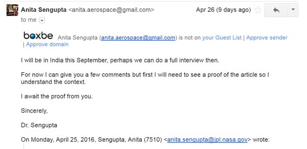 এ বার মহাকাশে সেই ‘রূপকথা’র ‘কাহিনি’ লেখার মূল দায়িত্বটাই রয়েছে বঙ্গনারী অনিতার হাতে। এমনও নয় যে, এই প্রথম মহাকাশে ‘রূপকথা’ লিখতে চলেছেন অনিতা! মঙ্গলের মাটিতে মার্কিন ‘রোভার’ মহাকাশযান- ‘কুমারী কৌতুহল’- ‘মিস কিউরিওসিটি’কে নামানোর জন্য যে ‘সুপারসোনিক প্যারাশ্যুট সিস্টেম’ ব্যবহার করা হয়েছিল, তার সিস্টেম্স ইঞ্জিনিয়ারিং-এর নেত্রী ছিলেন অনিতাই।