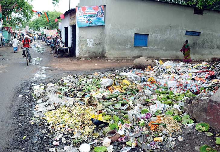 নিয়মিত সাফাই হয় না। খড়্গপুরের গোলবাজারে রাস্তার ধারে জমেছে আবর্জনার স্তূপ। ছড়াচ্ছে দূষণও। ছবি: রামপ্রসাদ সাউ।