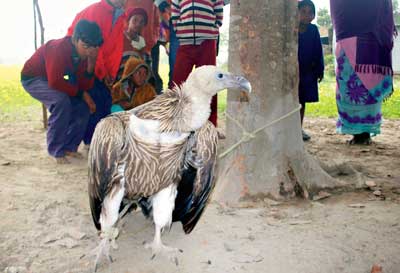 অসুস্থ শকুনটিকে বেঁধে রেখেছিলেন উত্তর দিনাজপুরের একটি গ্রামের আদিবাসীরা।