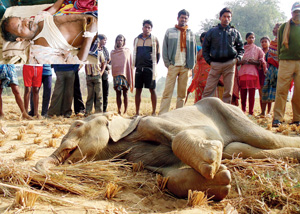 মাঠে পড়ে অসুস্থ হস্তিশাবক। (ইনসেটে) জখম নাড়ুগোপাল ঘোষ।—নিজস্ব চিত্র।