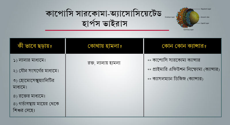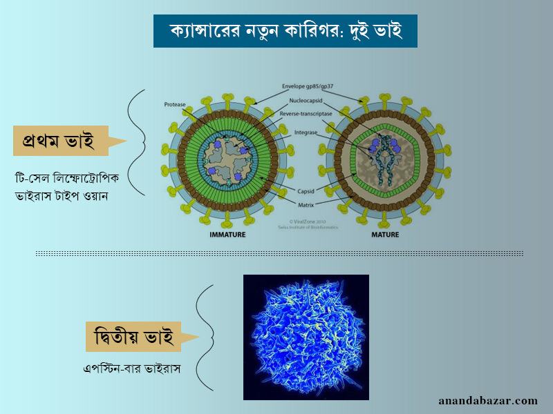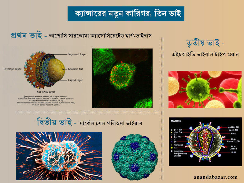 কনজাঙ্কটাইভ্যাল আই ক্যান্সার আর নন-মেলানোমা স্কিন ক্যান্সার হয়। সারা বিশ্বে মানুষের যত রকমের ক্যান্সার হয়, দেখা গিয়েছে তার ১২ শতাংশের জন্যই মূলত দায়ী নানা রকমের ভাইরাস। ক্যান্সারের সম্ভাব্য ‘কারিগর’ নতুন যে পাঁচটি ভাইরাসের হদিশ মিলেছে, তার কোনওটিরই টিকা বা প্রতিষেধক এখনও বেরোয়নি। কবে সেগুলির আবিষ্কার হবে, তারও কোনও ঠিক-ঠিকানা নেই। ফলে এই ভাইরাসগুলি এখন উদ্বেগের কারণ হয়ে দাঁড়িয়েছে যথেষ্টই।’’