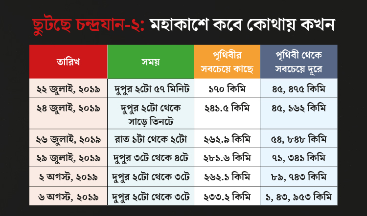 তাই ইসরো জানাচ্ছে, গত ২৪ জুলাই দুপুর ২টো থেকে বিকেল সাড়ে তিনটের মধ্যে চন্দ্রযান-২কে কম্যান্ড পাঠিয়ে ঠেলেঠুলে পাঠিয়ে দেওয়া হয়েছে যে উপবৃত্তাকার কক্ষপথে, সেখানে চন্দ্রযান-২ ছিল পৃথিবী থেকে সর্বাধিক ৪৫ হাজার ১৬২ কিলোমিটার দূরত্বে। ওই দিন আমাদের সবচেয়ে কাছে যখন এসেছিল চন্দ্রযান-২, তখন তার দূরত্ব ছিল ২৪১.৫ কিলোমিটার।