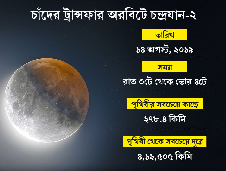 ওই দিন রাত ৩টে থেকে ভোর ৪টের মধ্যে চন্দ্রযান-২ ঢুকে পড়বে সোজা চাঁদের যাওয়ার রাস্তায়। বিজ্ঞানের পরিভাষায় যাকে বলা হয়, লুনার ট্রান্সফার অরবিট। যখন পৃথিবীর অভিকর্ষ বল আর চন্দ্রযান-২-এর উপর কার্যকরী হবে না। ওই সময় চন্দ্রযান-২ পৃথিবী থেকে থাকবে সর্বাধিক ৪ লক্ষ ১২ হাজার ৫০৫ কিলোমিটার দূরে। ভূপৃষ্ঠ থেকে ২৭৮.৪ কিলোমিটার উপরে।