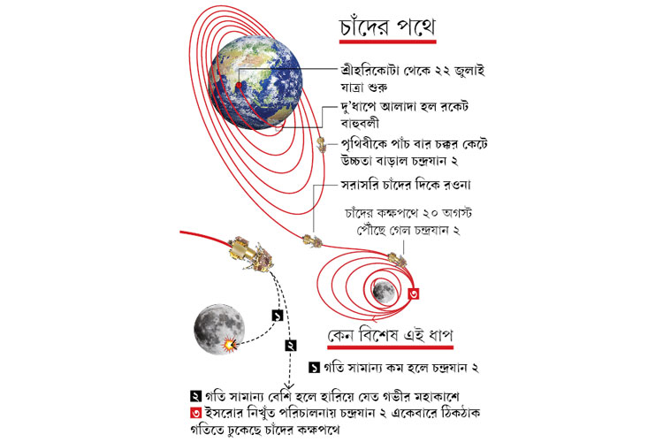 তার আগে কক্ষপথ আড়ে-বহরে কমানো হবে ধাপে ধাপে। সবচেয়ে ছোট কক্ষপথ হবে ১০০x৩০ কিলোমিটার। মাঝে ২ সেপ্টেম্বর সারতে হবে একটি বড় কাজ। চন্দ্রযান ২-এর মডিউল দু’ভাগ করা। অরবিটার থেকে আলাদা হবে ল্যান্ডার বিক্রম। গোটা যাত্রা-পর্বের উপরে বেঙ্গালুরুর ‘ইসরো টেলিমেট্রি, ট্র্যাকিং অ্যান্ড কমান্ড নেটওয়ার্ক’-এর ‘মিশন অপারেশনস কমপ্লেক্স’ থেকে নজর রাখা হচ্ছে। সাহায্যের হাত বাড়াচ্ছে ‘ইন্ডিয়ান ডিপ স্পেস নেটওয়ার্ক’ও। ইসরো জানাচ্ছে, কাল বেলা সাড়ে বারোটা থেকে দেড়টার মধ্যে চন্দ্রযান ২-এর কক্ষপথে সামান্য বদল ঘটানো হবে।