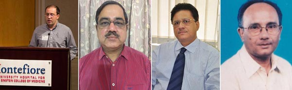 (বাঁ দিক থেকে) ক্যানসার বিশেষজ্ঞ জর্জ ক্যারিগিয়ান্নিস, সোমনাথ সরকার, গৌতম মুখোপাধ্যায় ও স্থবির দাশগুপ্ত