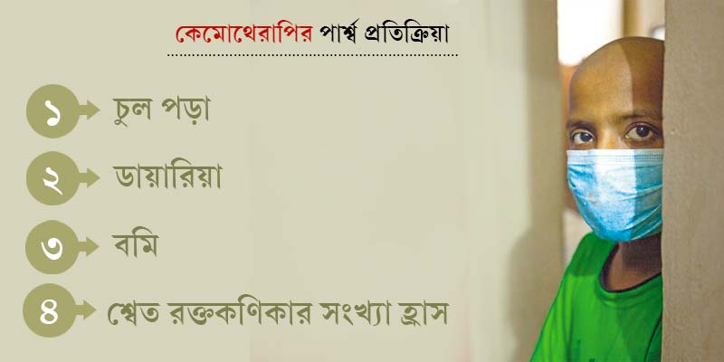 গৌতমবাবু অবশ্য স্বীকার করেছেন, কেমোথেরাপির ওই ওষুধগুলির কিছু কিছু পার্শ্ব প্রতিক্রিয়াও রয়েছে। চিকিৎসকরা যেগুলির সঙ্গে অনেক দিন ধরেই পরিচিত। সেই পার্শ্ব প্রতিক্রিয়াগুলির মধ্যে রয়েছে, চুল পড়া, ডায়ারিয়া, বমি ও কণিকার সংখ্যা দ্রুত কমে যাওয়ার মতো ঘটনাও। ওই পার্শ্ব প্রতিক্রিয়াগুলি হয় কেমোথেরাপির ওষুধ বা ইঞ্জেকশনের নিয়মিত ব্যবহারের জন্যই। যদিও সেই পার্শ্ব প্রতিক্রিয়াগুলি সাময়িক বলেই মনে করেন গৌতমবাবু।