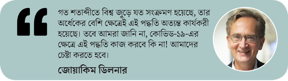 আমাদের ইনস্টিটিউটে সংক্রামক রোগ ও মহামারি সংক্রান্ত বিষয়ের অধ্যাপক জোয়াকিম ডিলনারের নেতৃত্বেই গোটা প্রক্রিয়াটা সম্পন্ন হচ্ছে। প্রশ্নটা তাঁকে করেছিলাম। এই পদ্ধতি সফল হওয়ার সম্ভাবনা কতটা? জোয়াকিম বললেন, ‘‘গত শতাব্দীতে বিশ্ব জুড়ে যত সংক্রমণ হয়েছে, তার অর্ধেকের বেশি ক্ষেত্রেই এই পদ্ধতি অত্যন্ত কার্যকরী হয়েছে। তবে আমরা জানি না, কোভিড-১৯-এর ক্ষেত্রে এই পদ্ধতি কাজ করবে কি না! আমাদের চেষ্টা করতে হবে।’’