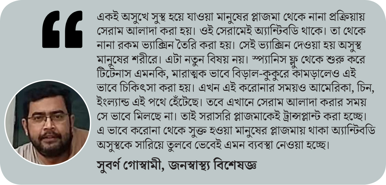 বিংশ শতাব্দীর গোড়ার দিকে যখন স্প্যানিস ফ্লু হয়, তখন থেকে মহামারির সময়ে রক্ত ট্রান্সফিউশনের পদ্ধতি প্রচলিত। আমাদের শরীরে যখন কোনও ভাইরাস আক্রমণ হানে, তখন রক্তের প্লাজমায় কিছু অ্যান্টিবডি তৈরি হয়। তারাই ওই ভাইরাসটির সঙ্গে লড়তে সাহায্য করে।তাই, ভাইরাসে সংক্রমিত হওয়ার পর একেবারে সুস্থ হয়ে যাওয়া কোনও ব্যক্তির রক্তের প্লাজমা প্রথমে সংগ্রহ করা হয়। তার পর সেই প্লাজমা দেওয়া হয় মারণ ভাইরাসে আক্রান্ত হয়ে লড়াই করা ব্যক্তির শরীরে। আসলে যিনি সুস্থ হয়ে উঠেছেন, তাঁর শরীরের অ্যান্টিবডি ভাইরাস মোকাবিলায় সক্ষম হয়েছে বলেই ধরা হয়। এ বার সেই অ্যান্টিবডিই যদি কোনও আক্রান্ত মানুষের শরীরে দেওয়া হয়, তা হলে তিনিও ভাইরাস মোকাবিলায় সক্ষম হতে পারেন। করোনা থেকে সুক্ত হওয়া মানুষের প্লাজমায় থাকা অ্যান্টিবডি অসুস্থকে সারিয়ে তুলতে পারে। অতীতে অনেক ক্ষেত্রে এই পদ্ধতি রীতি মতো কার্যকরী হয়েছে। কোভিড-১৯ রুখতে এ পদ্ধতি সক্ষম হবে কি না, সেটাই এখন প্রশ্ন।