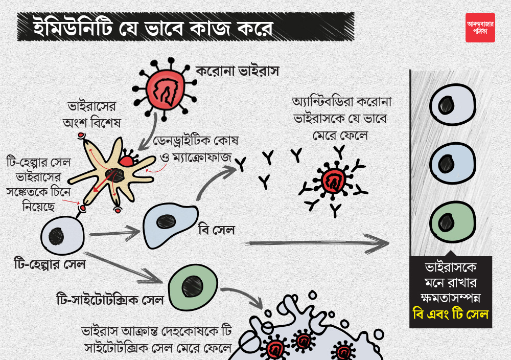 ইমিউনিটির অনেকগুলি ধাপ৷ শরীরে কোনও জীবাণু প্রবেশ করলে শরীর তার বাইরের খোলস দেখে চিনে নিয়ে সেটিকে ধ্বংস করার প্রস্তুতি নিতে শুরু করে৷ এই যুদ্ধের প্রথম সৈনিক শ্বেতকণিকা৷ জীবাণুটির প্রথম মোলাকাত হয় ডেনড্রাইটিক সেল ও ম্যাক্রোফাজ নামের দু’ধরণের শ্বেতকণিকার সাথে৷ এরা প্রথমে অল্প কিছু জীবাণুকে খেয়ে ফেলে। সেই মৃত জীবাণুদের কিছু অংশ, সাধারণত তাদের খোলসের অংশবিশেষকে নিয়ে নিজেদের কোষপর্দার বাইরে মেলে ধরে৷ শরীরের আরও একধরণের শ্বেতকণিকা (টি হাইপার সেল) এই জীবাণুর অংশটিকে চিনে নেয়৷ পরের ধাপে টি হাইপার সেল আরও দু’ধরণের শ্বেতকণিকা, বি সেল এবং টি সাইটোটক্সিক সেল জানিয়ে দেয়, শরীরে একটি জীবাণু ঢুকেছে আর এই হল তাকে চেনার সংকেত। এরপর বি সেলগুলি ওই জীবাণুকে মারতে অ্যান্টিবডি তৈরি করে৷ সেই অ্যান্টিবডি জীবাণুটিকে চারদিক থেকে বেঁধে মেরে ফেলে৷ আবার কিছু বি সেল ওই সংকেত মনে রাখে। যাতে পরে কখনও ওই একই জীবাণু আক্রমণ করলে চটজলদি অ্যান্টিবডি বানিয়ে ফেলা যায়৷ টি সাইটোটক্সিক সেল অবশ্য এত অ্যান্টিবডির ধার ধারে না৷ তারা ওই সদ্যপরিচিত জীবাণুটি যে দেহকোষকে আক্রমণ করেছে, সেই কোষটিকে জীবাণুশুদ্ধ হজম করে ফেলে৷