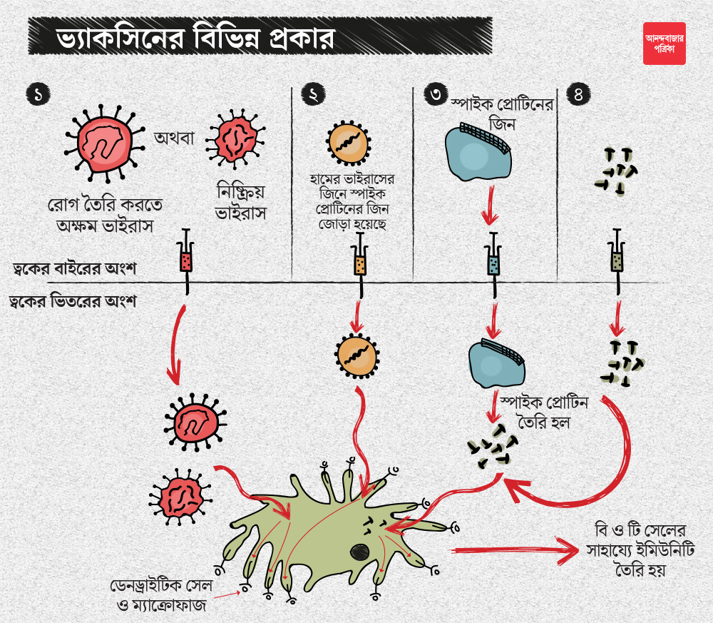 ৪. প্রোটিন ভ্যাকসিন: আগের পদ্ধতিতে যে জিন ঢোকানোর কথা বলা হয়েছে, সেই জিনটি স্পাইক প্রোটিনটি তৈরি করবে৷ স্পাইক প্রোটিনটিকে আলাদা করে বানিয়ে ইঞ্জেকশন দিয়ে সরাসরি শরীরে ঢুকিয়ে দিলেও হয়। শরীর তার মোকাবিলায় অ্যান্টিবডি তৈরি করে। হায়দরাবাদের বায়োলজিক্যাল ই এই রাস্তাতেই হাঁটছে৷