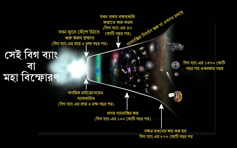 ১৪০০ কোটি বছর আগে বিগ ব্যাং-এর পর থেকে এখনও পর্যন্ত যে ভাবে ধাপে ধাপে গড়ে উঠছে, ফুলে, ফেঁপে উঠছে আমাদের ব্রহ্মাণ্ড
