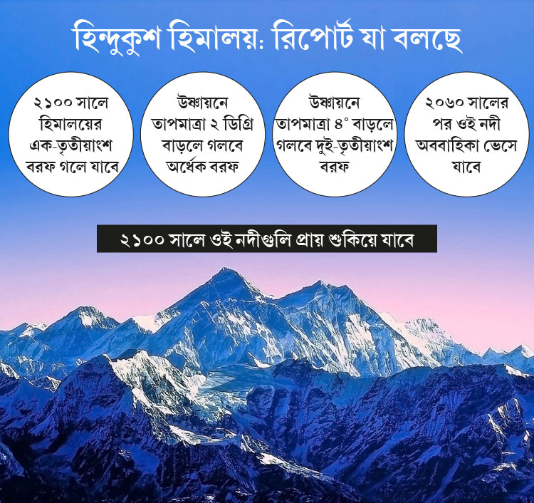 হিমালয়ে সেটাই এত দ্রুত হারে হচ্ছে যে আর ৮০ বছরের মধ্যেই তার এক-তৃতীয়াংশ বরফ পুরোপুরি গলে যাবে। আর বিশ্ব উষ্ণায়নের তাপমাত্রার বাড়-বৃদ্ধি যদি ২ ডিগ্রি সেলসিয়াসের মধ্যে আটকে রাখা যায়, তা হলেও অর্ধেক বরফই গলে যাবে হিন্দুকুশ পর্বতমালার। উষ্ণায়নের তাপমাত্রা ৪ ডিগ্রি সেলসিয়াস বাড়লেই গলে যাবে দুই-তৃতীয়াংশ বরফ।