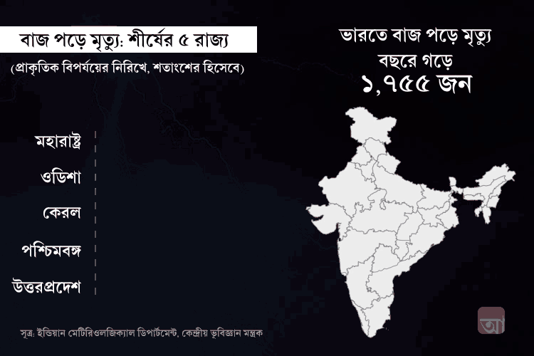 ফি বছর ভারতে প্রাকৃতিক দুর্যোগে প্রাণ হারান যত মানুষ, তার একটি বড় অংশের মানুষের মৃত্যু হয় মাথায় বা শরীরের বিভিন্ন অংশে বাজ পড়ায়। কেন্দ্রীয় আবহাওয়া দফতরের ২০১৪ সালের পরিসংখ্যান জানাচ্ছে, এ দেশে বাজ পড়ায় বছরে গড়ে মৃত্যু হয় ১ হাজার ৭৫৫ জনের। সাম্প্রতিক অতীতে বাজ পড়েমৃত্যুর ঘটনা সবচেয়ে বেশি ঘটেছে মহারাষ্ট্র, ওড়িশা ও কেরলে। খুব একটা পিছিয়ে নেই রাজস্থান, উত্তরপ্রদেশ, পশ্চিমবঙ্গের মতো রাজ্যগুলিও। ২০১৪–র পরিসংখ্যান জানাচ্ছে, প্রাকৃতিক দুর্যোগে যত মানুষ প্রাণ হারিয়েছেন মহারাষ্ট্রে, তার ২৯ শতাংশেরই মৃত্যু হয়েছে বজ্রাঘাতে। ওড়িশা আর কেরলে সেই হার যথাক্রমে ২৭ এবং ২০ শতাংশ। তালিকায় বেশ সামনের সারিতেই রয়েছে পশ্চিমবঙ্গের নাম। চার বছর আগে প্রাকৃতিক দুর্যোগে যত মানুষ প্রাণ হারিয়েছিলেন এ রাজ্যে, তার ১২ শতাংশের মৃত্যু হয়েছিল বজ্রাঘাতে। আর উত্তরপ্রদেশে সেই হার ৯ শতাংশ।