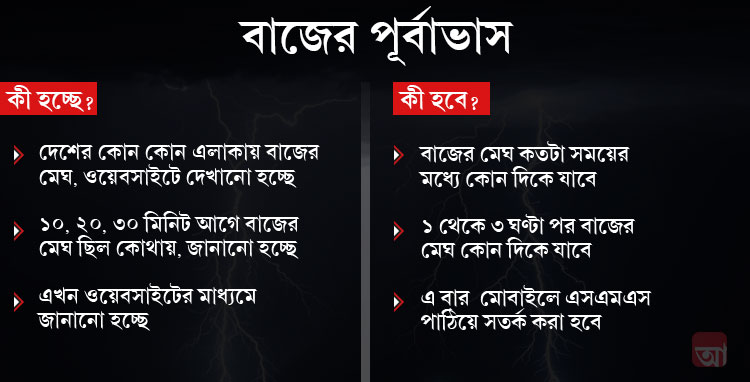 অসীমবাবু জানাচ্ছেন, এখন আবহাওয়া দফতরের ওয়েবসাইটে (www.imd.gov.in) ১০, ২০ এবং ৩০ মিনিট আগে দেশের কোন কোন এলাকায় বজ্রগর্ভ মেঘের সৃষ্টি হয়েছিল, তা জানিয়ে দেওয়া হচ্ছে।