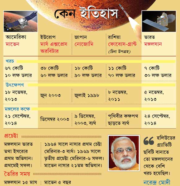 বুধবার সকালে নির্ঘণ্ট মেনেই লাল গ্রহের কক্ষপথে ঢুকে পড়েছে মঙ্গলযান। প্রথম চেষ্টাতেই নিজেদের দূতকে মঙ্গলের কক্ষপথে বসিয়ে দিতে পেরেছেন ভারতীয় মহাকাশ গবেষণা সংস্থার বিজ্ঞানীরা। বিশ্বে আগে কেউ যা পারেনি! “এ দিক থেকে আমরা নাসা, রাশিয়া, ইওরোপীয় মহাকাশ গবেষণা সংস্থাকেও টপকে গিয়েছি,” বললেন ইসরোর জনসংযোগ অধিকর্তা দেবীপ্রসাদ কার্নিক।