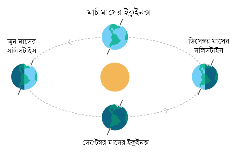 আমেরিকার জন্স হপকিন্স বিশ্ববিদ্যালয়ের জ্যোতির্বিজ্ঞানের অ্যাসোসিয়েট প্রফেসর সুনন্দ মুখোপাধ্যায় বলছেন, ‘‘পৃথিবীর বিষূবরেখা (ইক্যুয়েটর) থেকে সূর্যের ঠিক মাঝখান দিয়ে চলে যাওয়া একটি সরলরেখা কল্পনা করলে সেই রেখাটির ওপর যে তলটি (প্লেন) দাঁড়িয়ে থাকে, তাকেই জ্যোতির্বিজ্ঞানের পরিভাষায় বলে, ‘ভার্নাল ইক্যুইনক্স’। উত্তর গোলার্ধ বা নর্দার্ন হেমিস্ফিয়ারে ওই ‘ভার্নাল ইক্যুইনক্স’টি তৈরি হয় ফি-বছর ২০ মার্চ থেকে। ওই দিনটি থেকেই উত্তর গোলার্ধে শুরু হয়ে যায় বসন্ত কাল (স্প্রিং)। ওই সময় পৃথিবীর বিষূবরেখার ঠিক ওপরে থাকে সূর্য।’’
